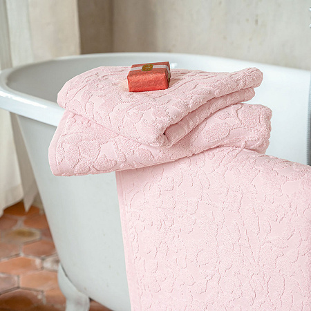 Aura Rose est disponible en drap de bain 90×150 cm, en serviette de toilette 50×100 cm, en drap de douche 70×140 cm et en peignoircol kimono XS, S, M, L et XL.