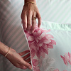 Des dahlias majestueux aux tons lactés de menthe et de grenadine évoquent un milk-shake d’été. Le revers s’anime de rayures transat blanches et aqua. Un biais blanc lumineux souligne cette parure joyeuse.