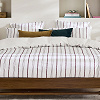 Le modèle épure est réver­sible avec au verso de fines rayures violettes et parme et une percale blanche sur le verso.