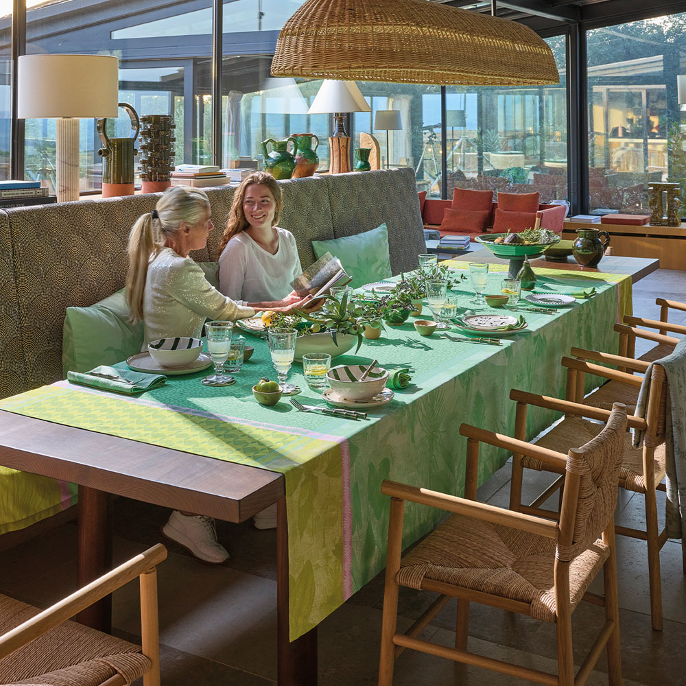 Sinharâja Jungle se décline en nappes carrées 150×150 cm et 175×175 cm, en nappes rectangulaires 150×220 cm, 150×260 cm, 175×250 cm et 175×320 cm, en set de table 50×36 cm (vendu par 4), en chemin de table 50×150 cm et en serviette de table en coton 58×58 cm (vendue par 4).