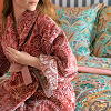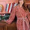 Inspiré de l’héritage textile, le motif Ensoleillé déploie sa richesse ornementale sur un peignoir en jacquard velours à col châle, habillé d’un brun chaleureux aux reflets orangés et ponctué d’une ceinture texturée en contraste délicat.