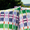 L’été ose les colorblocks puissants, vert gazon, parme, rose grenadine, bleu outremer et habille un motif graphique abstrait sur un blanc éclatant. Une palette vive et joyeuse, où l’été se célèbre en couleurs franches et en contrastes affirmés.