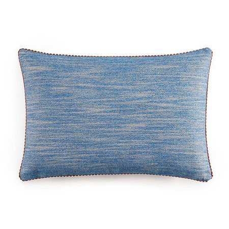 Housse de coussin texturé à base de lin, rectangulaire en 40×60 cm. Finition passepoil simili cuir. Disponible ici en coloris bleu Nymphéa.