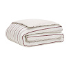 Le modèle épure est réver­sible avec au verso de fines rayures violettes et parme et une percale blanche sur le verso.