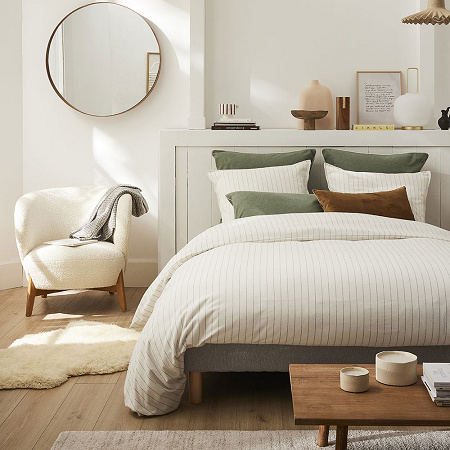 Essix nous présente un modèle idéal pour les nuits fraîches et les moments de détente. Rien de tel que la flanelle. Équilibre allie matière régressive et inspiration actuelle. Parée d’élégantes rayures coloris Lichen sur un fond écru doux, la parure a été pensée comme un basique intemporel, aussi facile à associer à des motifs qu’à des unis.