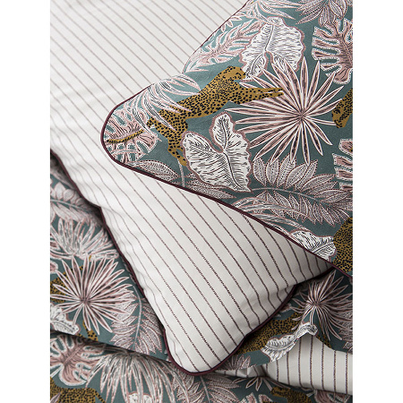Ce modèle représente une jungle tropicale où les palmes se tournent vers le solieil. Luxuria est aux couleurs de l’été. Ne soyez pas surpris car Vous verrez parfois aparaitre un jaguar sautant par dessus les feuilles. Ce modèle est réversible avec au verso de fines rayures violettes sur une percale blanche.