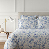 Une composition légère et élégante de branches fleuries où les oiseaux délicatement posés admirent le paysage. Mise en couleur dans une palette de bleus iconique des porcelaines chinoises.