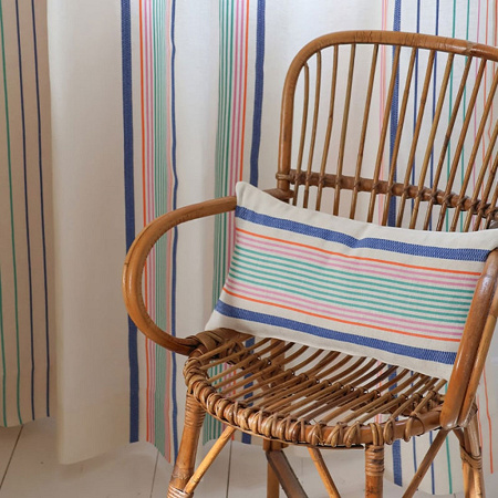 L'héritage traditionnel basque se transmet dans ce tissu à travers les rayures et le tissage ottoman à petits carreaux qui apporte du relief à cette toile. Le mélange de lin et de coton est typique du linge basque. De plus, ce pas de rayures s'inspire du ciel multicolore des couchers de soleil de nos belles soirées d'été. Ce mélange de couleurs évoque la douceur estivale et sintègre parfaitement à un intérieur en lui apportant beaucoup de charme.