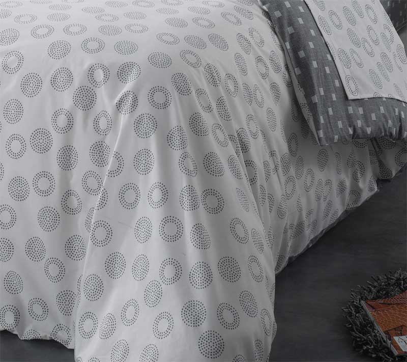 Housse de couette Graphic de la marque Jour de Paris. réversible, 1 face ronds dans l'eau, 1 face all-over carrés, finition forme bouteille, rabat de 40 cm. Ce modèle 100% coton se décline dans les dimensions suivantes :