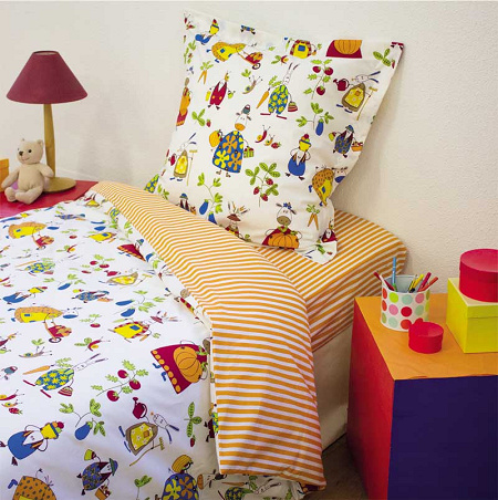 La maison de Balmy nous présente « Nicolas » qui est un coordonné d’animaux de la ferme déguisés avec une fine rayures orange et blanche