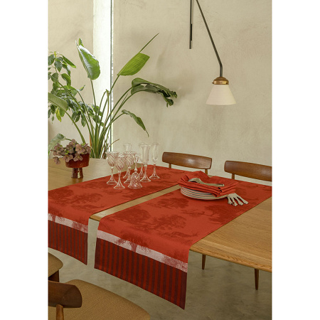 Chemin de table Souveraine coloris Carmin. Ce modèle est disponible en taille 50x150 cm.
