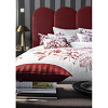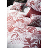 Dans une chambre à l’élégance contemporaine, cette parure devient la pièce maîtresse de la décoration. Sur un fond blanc lumineux, un grenat profond éclot en bouquets de feuilles stylisées. Le dessin, à la fois structuré et délicat, capte le regard par sa force graphique et s’intègre avec justesse dans des intérieurs sobres et raffinés. Chaque motif est soigneusement placé sur chaque pièce, soulignant l’exigence du détail. Une finition en passepoil contrastant vient parfaire l’ensemble, ajoutant une touche d’élégance subtile et maîtrisée.