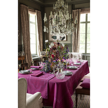 Palais Vénitien Pourpre est disponible en nappe carrée en 120x120 cm et 175x175 cm et en nappe rectangulaire 175x250 cm et 175x320 cm.