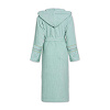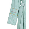 Ce long peignoir bleu à fines rayures est issu de la collection Soft Zellige. Les manches sont finies avec un passepoil fuchsia et ocre et un avec un magnifique motif jacquard. Ce peignoir a des poches latérales et une capuche. Ceinture à nouer.