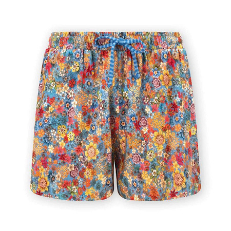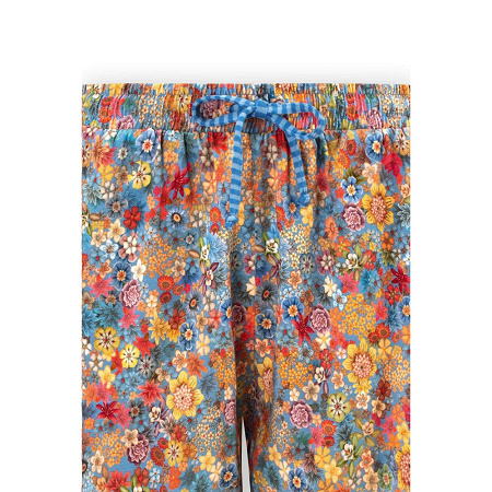 Le short est orné du motif Tutti i Fiori en bleu. De petites fleurs aux couleurs vives apparaissent çà et là parmi les fleurs, ce qui lui confère un aspect riche.