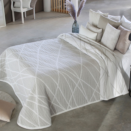 Couvre lit réversible en jacquard Dickie coloris écru (style gaufré). Ce modèle est disponible en 190x270 cm (lit 90 cm 1 personne), en 235x270 cm (lit 140 cm 2 personnes), en 250x270 cm (lit 160 cm 2 personnes) et en 280x270 cm (lit 180 cm 2 personnes). Traits écru sur fond beige dessus et inversé dessous.