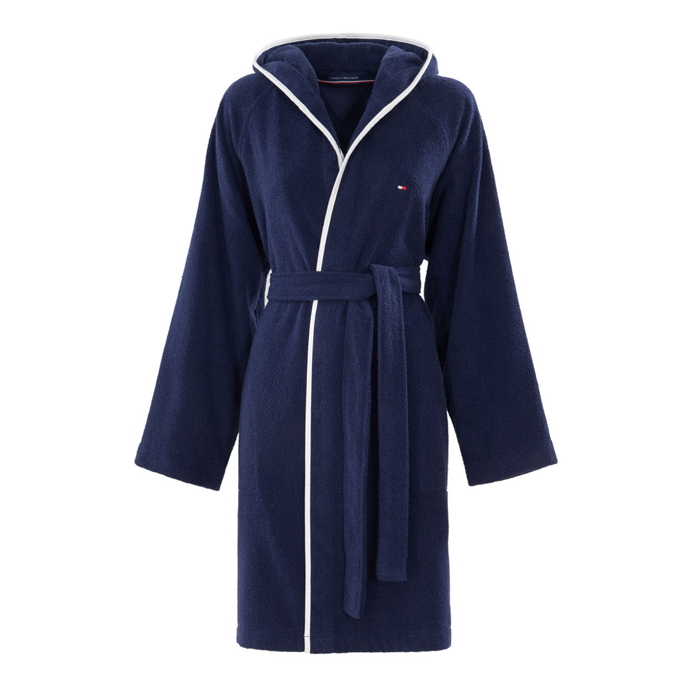 Tommy Hilfiger nous propose ici un peignoir esprit nautique pour un bain de douceur. Capuche fils teint velours ciselé. Manches droites, Broderie du drapeau sur la poitrine, Passepoil blanc, broderie Hilfiger 1985 dans le dos, Longeur 115 cm pour la taille L