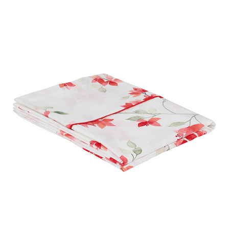 Le drap plat est Imprimé d’un motif floral aquarellé rouge et vert sur fond blanc. Parement de 20 cm délimité par un passepoil plat rouge. Il est disponible dans les tailles suivantes :180×290 cm, 240×300 cm et 270×300 cm.