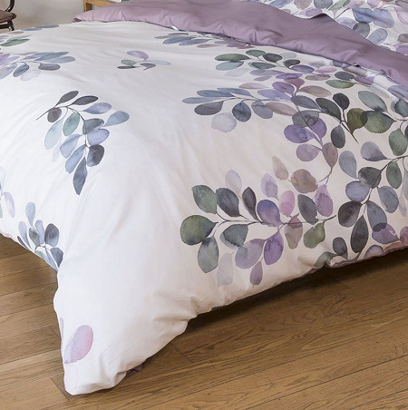 La housse de couette est imprimée motifs floraux sur le recto et satin uni parme sur le verso. Elle est disponible dans les dimensions suivantes : 140×200 cm, 200×200 cm, 240×220 cm et 260×240 cm. Finition forme bouteille.